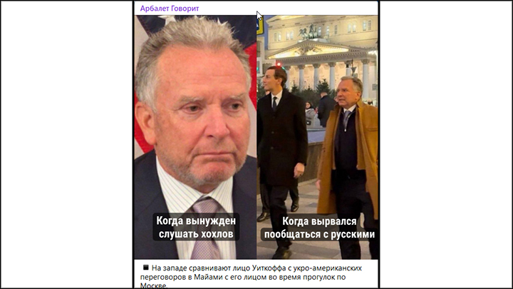 Это же провал! И есть ведь из-за чего паниковать: мало того что Уиткофф с явным удовольствием общается с русскими. Так он ещё и "русскую агентку" с собой привёз! Уж она-то напереводит – так расставит акценты, что всё перевернёт с ног на голову.