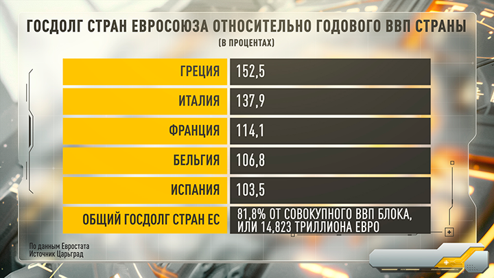 Между тем в Европе экономический кризис. По данным Евростата, в Германии промышленное производство в августе рухнуло на 4,3% — до уровня 2005 года. Во Франции нарастает кризис бюджетный: дефицит казны достиг 4% ВВП, а долг страны — свыше 114% ВВП. В России, находящейся под всеми санкциями, для сравнения, всего 20% ВВП. В Италии госдолг — почти 138% ВВП. А ведь это три крупнейшие экономики Евросоюза!