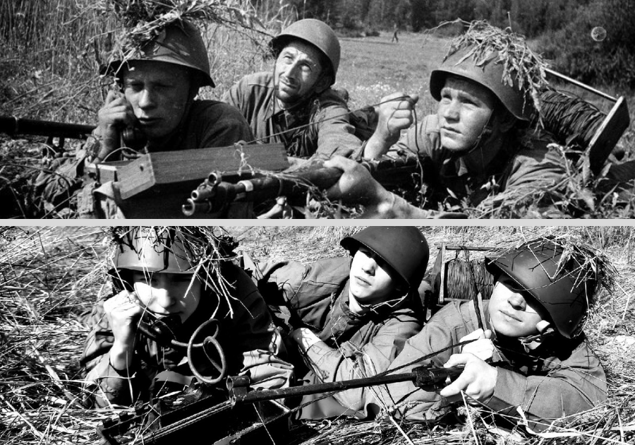 На первом фотоснимке пулеметчик гвардии рядовой Ефим Костин, награжденный орденом Красной Звезды. Он активный участник четырех боевых операций. В период Великой Отечественной войны в борьбе с немецкими захватчиками был четыре раза ранен. Фото датировано 1944 годом с пометкой "Ленинградский фронт". Правнук Победы - студент ивановского юридического колледжа Исаев Матвей "оживил" героя этого кадра фронтовых будней.