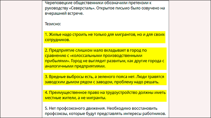 Работники же "Северстали" регулярно жалуются на слабую социальную поддержку и приоритетное внимание дирекции к нуждам мигрантов, но не сотрудников из числа коренного населения.