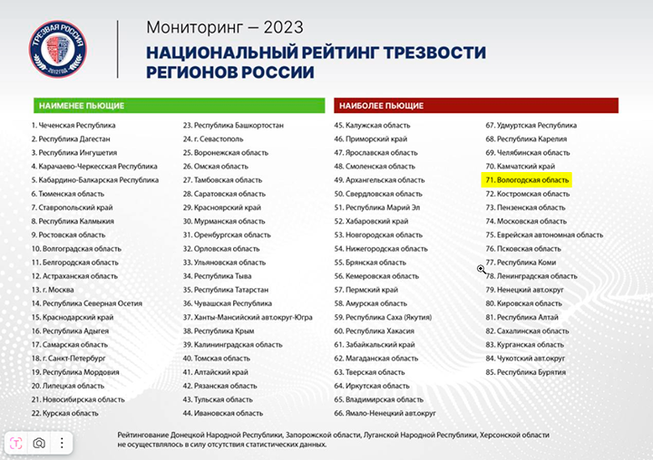 Рейтинг трезвости регионов России за 2023 год. Вологодчина – антилидер. Скриншот страницы сайта nversia.ru