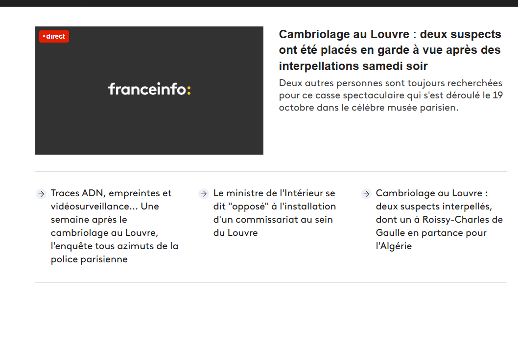 Ограбление Лувра - тема номер один в зарубежных СМИ: вот уже неделю журналисты следят за ходом расследования. ФОТО: Скриншот Franceinfo
