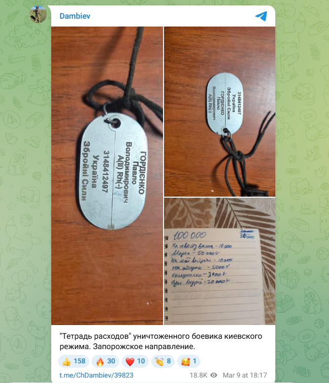 Любопытный "документ" нашли у ликвидированного в Запорожской области боевика. При нём кроме металлического жетона с установочными личными данными обнаружилась тетрадка. Фотографию с вещами выложил военкор Чингис Дамбиев.